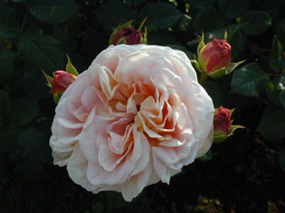 大輪で多弁花、夏にも花をつける。花色は杏色+黄色で、フルーツの香。刺がとても多く、葉は暗緑色で革質。丈夫な樹で、株全体はモダンローズ風。