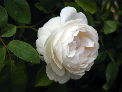 「メアリー ローズ」の白色枝変わり品種。さわやかな雰囲気の白花で、ときおり花にピンクが浮かぶことがある。細い枝からも花の咲く枝が伸びるので、剪定のときに切りすぎないよう注意が必要。