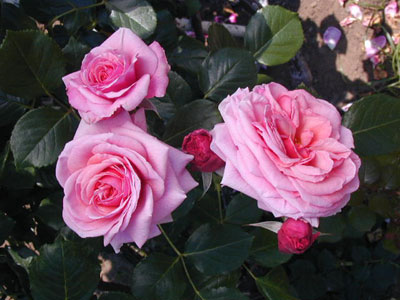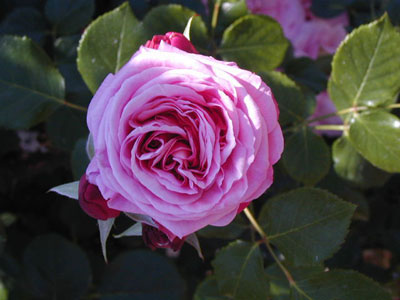 ややライラック味のピンクの花弁が60枚ぐらいあり、弁裏が濃い。健康な樹で暗緑色で革質の葉。つる性品種もある。