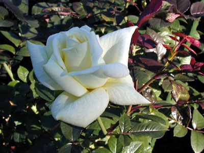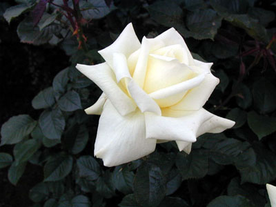 白がややアイボリークリームを感じさせる花色。モナコ公国第一王女、キャロリーヌの名をもつにふさわしい、清楚な風情。、花つき、花もちが良いので切花にも向く。対病性に優れ育て易い。