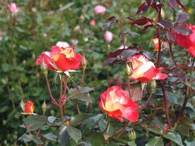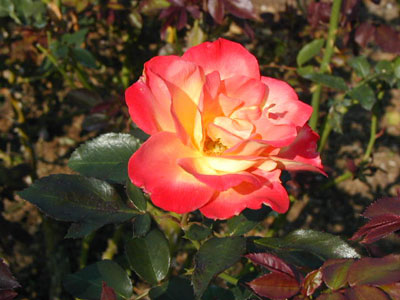 花色が咲き始めは黄色味が強く、咲き進むにつれ赤みが強くなる。花付も良いので満開時は黄色から赤の華やかなグラデーションになる。