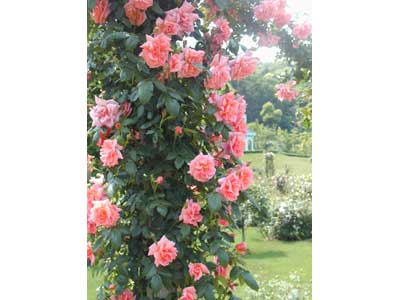 別名「デイリー・メール」。かなり伸長力のあるつるバラで、コーラルレッドに黄色のぼかし。ハイブリットティ形の蕾がゆるく開いて、平咲きに近い半八重の花になる。