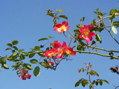 咲き始め中心は黄で、次第に紅が強くなると同時に、黄色が抜けて白に近くなる。1枝に多くの花がつき、一重ながら見ごたえがある。葉は光沢のある濃い緑色。秋もかなり咲く。もともとシュラブだが、日本ではつるバラとして扱われることが多い。