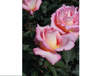ピンクの花弁の根元にクリーム色のぼかしが入る。花形がくずれにくい半剣弁高芯咲き。すばらしい芳香をもつ。株は半直立性で強健なので栽培し易い。