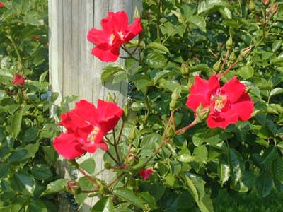 明るい深紅色で半八重咲きの花が房になる。光沢のある良葉。