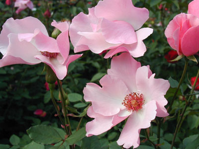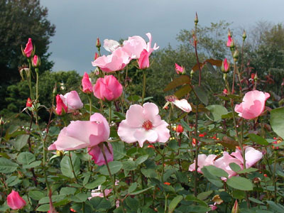 平咲きのハイブリッド・ティーの名花。作出されてからだいぶ時間が経つが、いまだに人気が高い品種。一重だが花弁がやや波打ち、花芯の美しい紫色と花色の対照が高貴な雰囲気を醸し出す。3〜4輪の房咲きになり、すっきりした香りを持つ。直立性で、初夏から秋まで咲きつづける。
