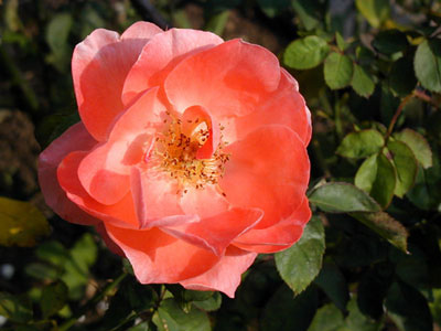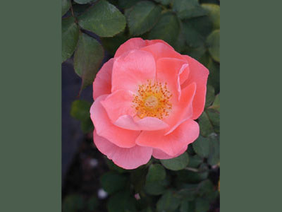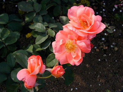 明るいオレンジの強いピンクで柔らかな形の花が房咲きになり甘く香る。樹はコンパクトなブッシュタイプ。葉は暗緑色。