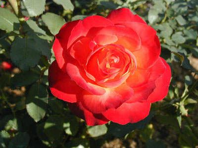 FL/四季咲き/八重/半剣弁高芯咲き/オレンジ&レッド/香り1/葉/ブッシュ横張り性/ 80