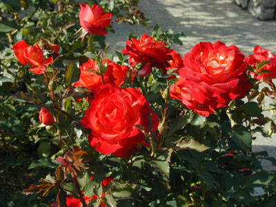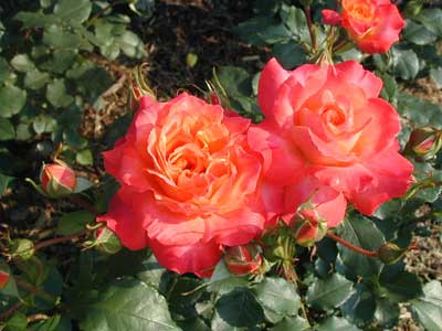 花びらの外縁があざやかな紅、中心近くや裏側が黄橙です。開くにつれオレンジからあざやかな紅 へ色合いを変化させ、華やかな印象を与えます。半剣弁咲きで、花つきもよいほうです。