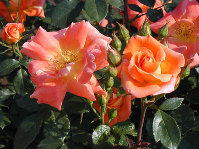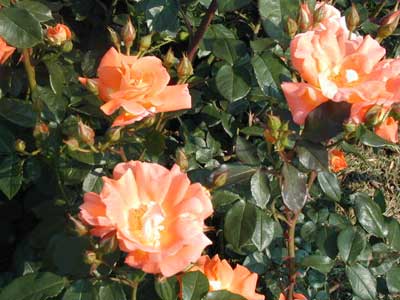 咲きはじめは剣弁高芯ですが、開花から開き終わるまでが早く、すぐに平咲きに変わる。花が房状になり、花の数も多いく、早くから咲き始め、絶え間なく花をつける。黒点病には強いが、暑さにはやや弱い。