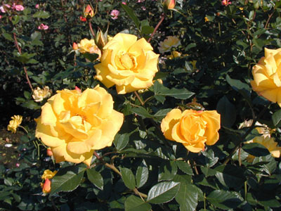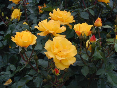 少し赤みがかった濃い黄色でまさにゴールド。数輪が房状になって咲き、光沢のある葉によく映えます。株は強健で病気にもよく耐えます。