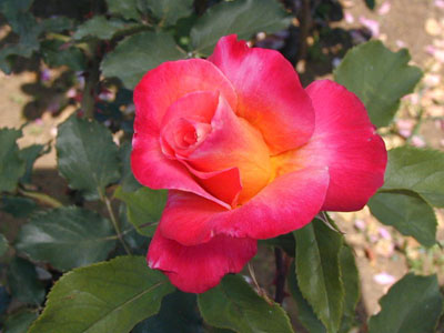 形のよい蕾が開いて、明赤色、イエローの高芯咲きの花になる。HTとしてはコンパクトな樹形。