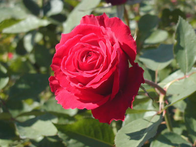 ローマ大賞を受賞した、日本作出の名花で、ビロード光沢のある個性的な赤色。花もちがよく、ティーとダマスクを合わせたほのかな香りをもつ。株が古くなるほどよい花が咲き、高温多湿にも耐える、強健種。