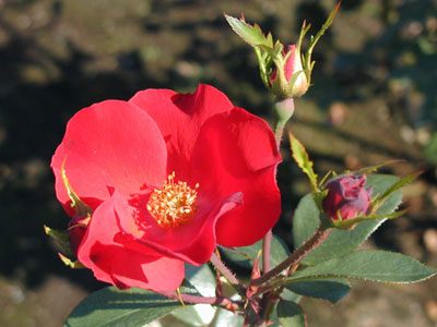 ステムが直線的でその先に平咲きに咲く赤い一重の花は、まさに風車のよう。耐寒性に優れた強権種。