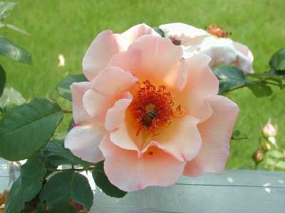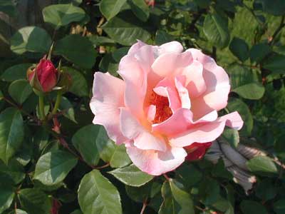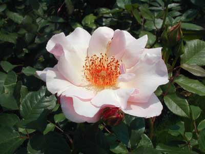 大変に美しいつるバラ。大輪の一重咲きで杏色を帯びた淡いピンクに、雄しべの赤味の強いゴールドが華やかさを演出する。芳香性。葉は光沢のある暗緑色。