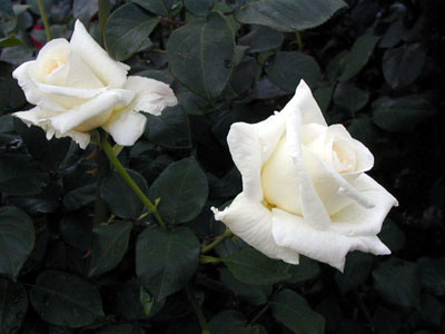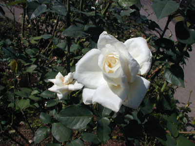カリフォルニアにあるシャスタ山が名の由来で、堂々とした花の白さが雪をいただく山を思わせます。中心は淡いクリーム色。つぼみは外側に淡いピンクのぼかしがかかることがある。葉は鈍い緑色。白バラのわりには強健です。