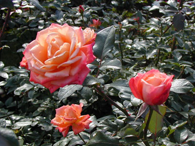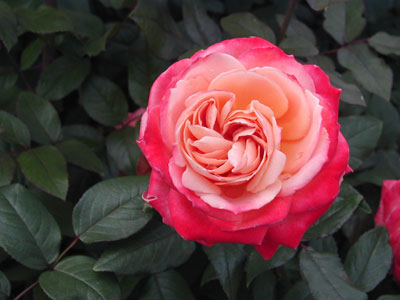 花色が独特で、全体的にはピンクだが中心に行くほど黄色が強いため、中心部はコーラルピンクからアプリコットの色合い。この色の変化が美しく、雅やかで王朝の名にふさわしい。丈夫。