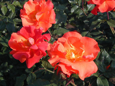 美智子妃殿下にささげられた、フロリバンダの名花のひとつで、花は濃いオレンジ。開くと平咲きになって、中心にわずかに黄色がのぞきます。花つきがよく、大きな一房をつくります。病気に強く、育てやすい優良種です。