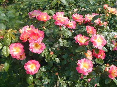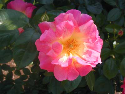 濃い目のピンクと黄色の人目を引くバラ。半八重咲きのカップ状の花で、かすかに香る。強健な樹に、ずば抜けて健康な暗緑色の葉。