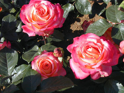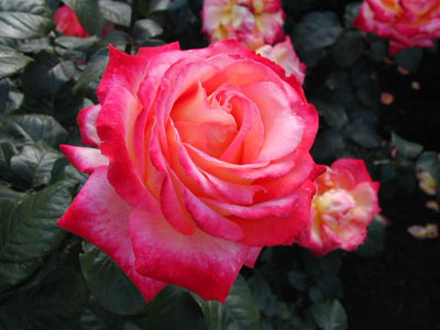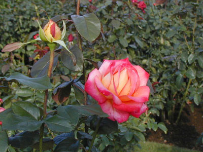 HT/四季咲き/八重/半剣弁高芯咲き/レッド&クリームイエロー/香り3/葉/ブッシュ横張り性/120