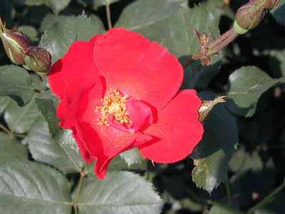 鮮やかな花色が目をひくバラ。比較的矮性で花壇の前面などに向く。同じ品種でつる性のものもある。