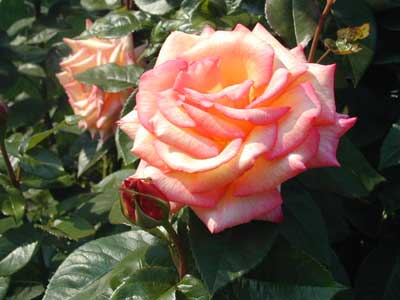 かなり花弁数の多い中輪の花。黄色味の強いアプリコットに濃いピンクの縁取りで、香りがすばらしい。黒っぽい照り葉。