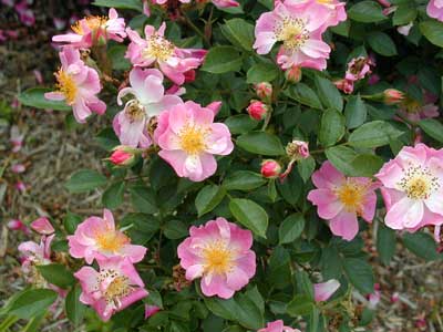 花は半八重咲きで大きな房になって大量に連続的に咲く。濃いめのピンクに、かすかに白の絞りが入る。花の割りに大きな金色の雄しべが目立つ。樹はグランドカバーに適して、横張り性で枝が密生する。