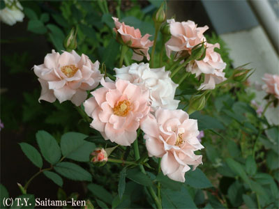 童話ピータパンに出てくる妖精、ティンカー・ベルの名を持つ可愛らしいバラ。最近の分類ではパティオローズ。状態がよいと一枝に10個以上5センチぐらいの花が、ダブルの平咲きで、房咲きになる。香りもよく、強健で、虫も付き難い。 (T.Yさん・埼玉県)