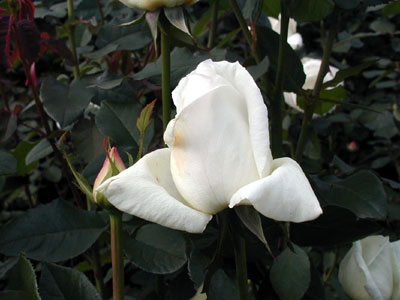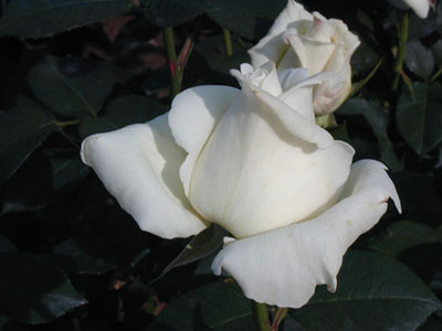 ややクリームを感じる白の巨大輪でフルーティな香りを持つ。樹形は直立性で強健だが、黒点病にやや弱い。