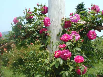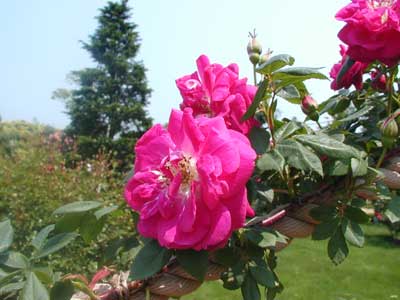 別名「クリムソン・ブールソー」。比較的花弁数の少ない八重咲きの花が房になって咲く。花色はパープルのかかった濃いピンク。刺のない花枝は長く、赤茶で、アーチ状になる。葉は紫味を帯びた暗緑色。