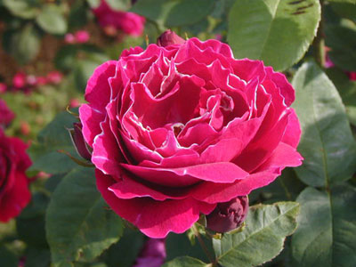 明るいクリムソンレッドの花弁に細く白い縁取り。芳香がありその上強健。ロジェ・ランプランと似ていますが、それより花色が濃くはっきりし、花びらの波が浅い。秋に少し返り咲くことがある。