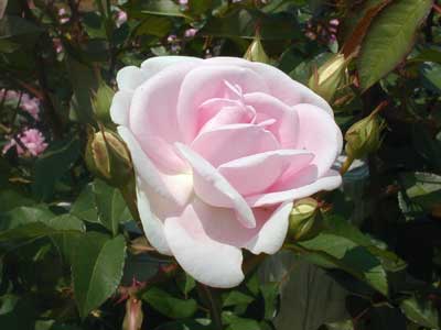 清清しいクリアーなピンクは弁先に行くに従いより淡く繊細なピンクになる。花は比較的大輪で咲き始めはカップ咲きで次第に平咲きになる。枝が強くないので、支柱などの支えが必要。