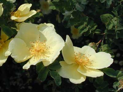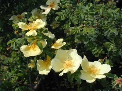 開花時期の最も早いバラのひとつ。しだれた枝に列をなして咲く花は明るい黄色で、特に花の中心は黄色が濃い。葯も鮮やかな黄色でよく目立つ。