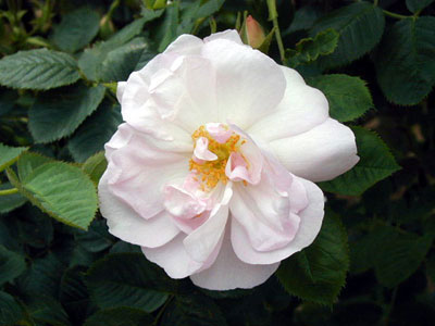別名「セレスト」。ほんのりピンクのさした美しい花が、暗緑色の葉に映える。古い品種で原種は不明。株は直立性に伸びるが、つるバラ風に仕立てることもできる。