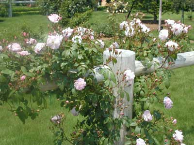 ロサ・キネンシス×ロサ・モスカータから生まれたノアゼットローズの先祖。八重咲きのピンクの花は大きな房になって咲く。耐寒性がある。