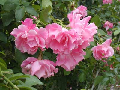 波打つ花弁が華々しいバラ。開花の最盛期には、小輪で多弁性の八重咲きの花が大きな房になる。葉は薄緑色で豊富、枝が密生し生育が旺盛な樹。