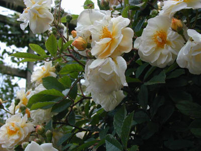 丈が低めのランブラーだが、支柱があると大型のブッシュのように仕立てることもできる。房咲きの花はオレンジ味の黄色だが、日光を浴びるとくすんだクリームに褪色する。光沢のある良葉でほとんど刺がない。