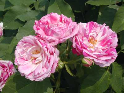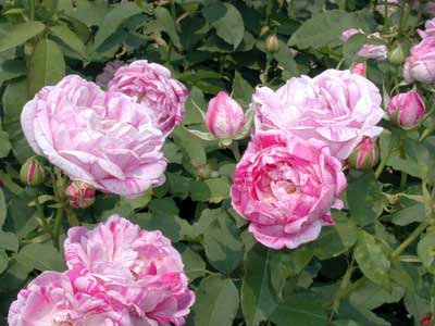 美しい絞り模様、淡いピンクの地にパープル味の濃いピンク。特に秋は一層発色がよい。球状のカップ咲きで、直径は6〜7cmくらい。原種は不明。とげが少ないので扱いやすい。