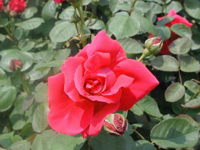花は暗く深い紅色で、形はハイブリッド・ティーに近い剣弁高芯咲きの形。秋に少し咲く。半つる状になるので、フェンスなどに誘引もできる。