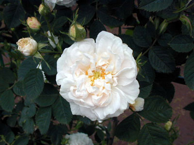 ジャンヌ・ダルクの名にふさわしい純白。株が比較的コンパクトなのと、花は雨に痛みやすいので鉢植えにするのも良い。