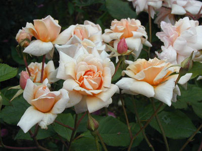 バフイエローにピンクのぼかしのある花が夏から秋にかけて房咲きになる。小輪で形がよく、完全な八重咲きで香りがよい。樹は強健。葉は柔らかく、濃い緑色で光沢がある。刺もあまりなく扱いやすい。鉢植えに向く。