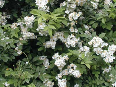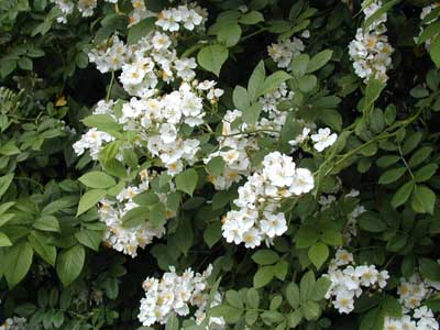 淡いクリーミーホワイトの一重咲きの可憐な花。小さな赤い実がなる。強健でグラウンドカバ、生垣など役に立つ。つるバラのように扱ってもよい。