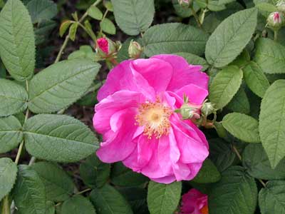 別名「ジ・アポテカリー・ローズ」。非常に古い品種で花は明るい深紅色の半八重咲きで、6月にはブッシュ全体に咲く。