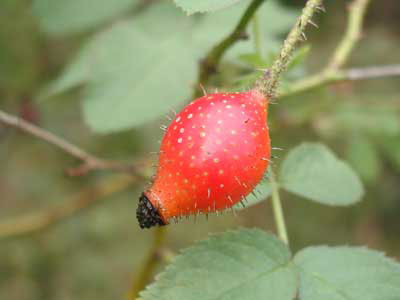 別名 Rosa villosa 「アップル・ローズ」。強健なシュラブで葉を揉むとよい香りがする。ピンクの一重咲きの花。実がとても大きく、深紅色でレモン形。