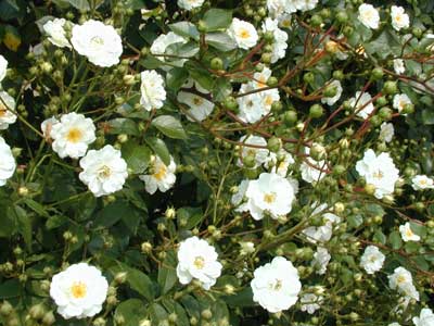 別名「シェークスピアズ・ムスク」。平咲きでクリーミーホワイトの小さな花が、房となって樹全体をおおいつくす。芳香をもち、秋には赤い実が鈴なりにつく。気候への適応性にすぐれた強健種。古い品種。