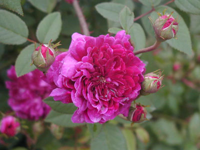 濃いピンクから紫色へと次第に花色が変化する。花びら数は多いものは100枚にもなる、ポンポン咲き。気温が高くなるとダマスク系の香り一層はっきりする。明治時代から栽培されている、日本で実生したガリカ系品種か。