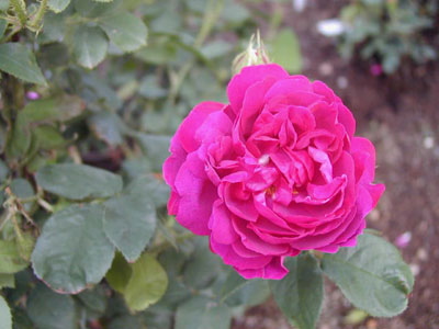 がくから花首にかけて腺毛で覆われるモス・ローズのひとつで、花色は紅に濃桃色や紫色が混ざったような複雑な色合い。