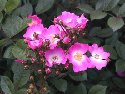 一重の小さな花が房状に咲く。よく咲き続け、耐病性も優れている。ポリアンサ系と思われるが正確な系統等は不明。